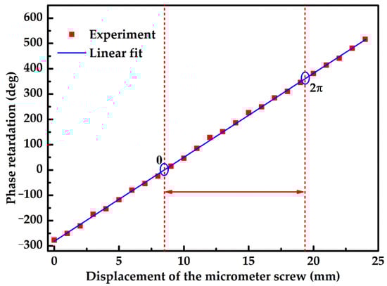where T is the temperature, which is 25 °C in the experiment. In the operation instructions, the theoretical value of 27.289 °/mm for the wavelength of 632.8 nm has been given, then the theoretical value of 32.979 °/mm can be derived from Equations (9) and (10). Therefore, the measured results agree well with the theoretical value, and the phase retardation characteristic of the SBC is measured well with the aid of the proposed scheme.