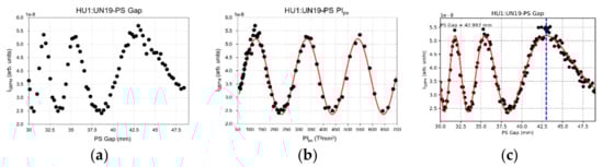 When all undulators (seven at SX1) change their gaps to vary the photon energy, all phase shifters should also change their gaps simultaneously to maintain the phase-matching condition between undulators. Since the undulator K changes for the photon energy scan, the scanning individual phase-shifter method is impossible to apply. Thus, setting the phase shifter phase integrals is only possible with the calculated values from Equation (7).