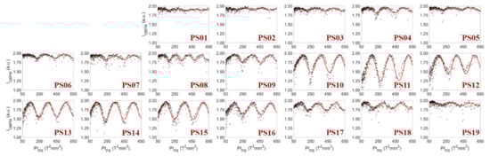 and its sine curve fitting to find the gap distance for phase matching. The gap of the phase-shifter was scanned sequentially for all phase shifters starting from the beginning (PS01) to the end (PS19). In this sequential way, the optimum gap obtained through scanning is not dependent on other phase shifters. All show a periodically oscillating pattern as a function of
