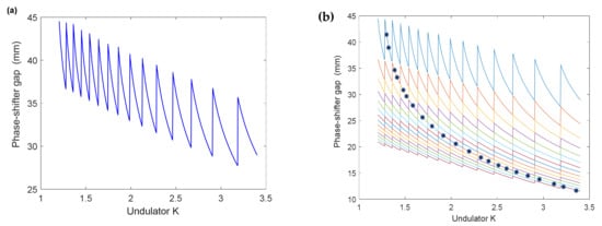 Figure 7a) can be used to maintain the phase-matching condition between undulators. However, 14 cases of significant changes in gap position are shown in the figure, which may result in a drop in FEL intensity during those changes. Instead, a continuous curved line depicted in (b), consecutively connecting from