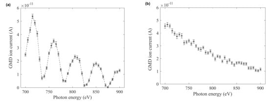 Figure 8b. The GMD ion current shows a lower value at higher photon energy because of decreased photoionization cross-sections of gas molecules. With increasing photon energy, the photoabsorption and the photoionization cross-sections of matter generally decrease [
