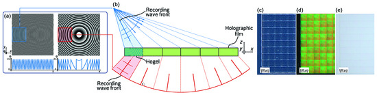The principle of holographic wave front printing is based on the recording of single holographic elements, introduced as Hogels. Hogels are recorded in a sequential, step-wise scheme and positioned adjacently to form an array-based vHOE. The recording of individual sub-holograms is based on the interference of two coherent, spatially modulated wave fronts, which interfere in the volume of a photosensitive material to form a three-dimensional diffraction grating. The recorded holographic function can be reconstructed by illuminating the Hogel with a characteristic wave front corresponding to the recording configuration. The recording wave fronts are modulated according to digitally designed phase patterns, and employed on SLMs to shape the recording beams by means of diffraction; thus, enabling each Hogel to be recorded with an individual optical function. A key characteristic of our employed holographic recording setup is the modulation of both the object as well as the reference recording wave front. A schematic representation of the hologram design process, given by the employed phase patterns as well as the recording in a sequential fashion, is presented in Figure 1. Furthermore, microscope images of the recorded vHOE under phase-contrast, dark-field and bright-field configuration are outlined.