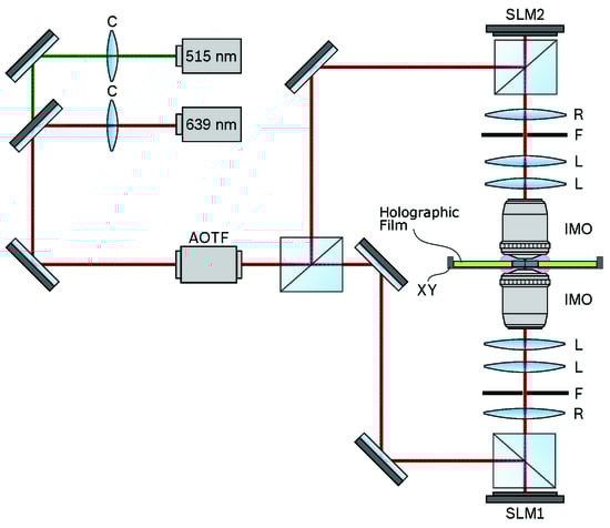 The wave front recording setup employs two optical light sources implemented as single-frequency diode-pumped solid-state lasers at 515 nm (Cobolt Fandango TM, 150 mW) and 639 nm (Lasos, RLK 40150 TS, 150 mW), respectively. The beams of both lasers are collimated using collimation lenses (C) and aligned on a common optical axis by means of a dichroic mirror. The resulting common beam is relayed to an acousto-optical filter (AOTF), which allows the tuning of both the beam’s optical power as well as the pulse length to precisely control the vHOE’s recording parameters. The object and reference beams are generated by evenly splitting the AOTF-modulated beam and relaying the two resulting beams to the respective SLMs. In the employed recording setup both the object and reference wave are individually shaped by means of two phase-only SLMs (Holoeye, GAEA-2). The main optical system, accommodating the recording wave front propagation, is implemented in an on-axis configuration with both SLMs being positioned at the opposite ends of two symmetrical optical systems (OS1, OS2), which are aligned on a common optical axis. The recording plane with the holographic film is positioned in the center of the setup between OS1 and OS2, with its surface normal being aligned in parallel to the common optical axis. The holographic film is laminated on a glass substrate and mounted on a high-precision, two-dimensional translation stage (Alio, AIOLM-35000E-350-XY, XY), which allows the controllable positioning of single Hogels with an accuracy of ∼ 10 . Subsequently, large-area vHOEs are fabricated by adjacently recording multiple Hogels in an array-based stepwise fashion. A schematic of the employed recording setup is outlined in Figure 2.