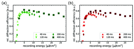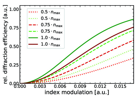 Maximum relative diffraction efficiencies of up to and and maximum index modulations of and are achieved for the green and red spectral functions, respectively. Overall, the outlined curves in Figure 5 demonstrate the expected behavior, containing a threshold initiation energy, followed by a strong increase in the relative diffraction efficiency and a transition into the saturated region.
