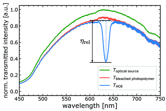 Normalized transmission spectrum of the employed optical source, a bleached photopolymer film and a recorded vHOE. The relative diffraction efficiency of the vHOE is determined from the vHOE’s chromatic selectivity, normalized to the bleached photopolymer film transmission spectrum.