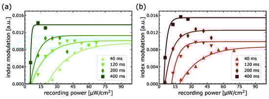 Derived index modulation values according to Equation (5) for holograms recorded in the green (a) and red (b) spectral function.