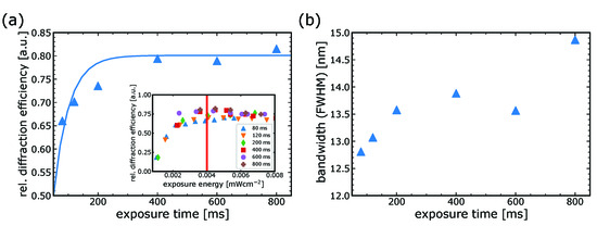 (a) Measured relative diffraction efficiencies of several holograms recorded at equal exposure energies; however, at different exposure times. A time dependence of the achievable diffraction efficiency can be observed. The inset outlines several power sweeps outlining, the saturation regime of the holograms at the evaluated energy level (red bar). (b) Outline of the vHOE’s bandwidth as FWHM for equal energy levels as displayed in (a).