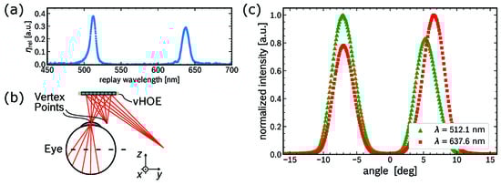(a) Relative diffraction efficiency of the multiplexed vHOE for a fixed incidence angle at . (b) Schematic of the vHOE’s global optical function with two vertex points. (c) Normalized chromatic intensity of the multiplexed vHOE measured at various angles of diffraction in the same half-sphere as the optical source. During the measurement, the optical source is positioned with a fixed incidence angle to the vHOE corresponding to the recording configuration.