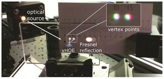 Further demonstration of the vHOE’s diffraction properties are outlined in Figure 11, which depicts the vHOE under illumination of a collimated white light probing source. The relative angle between the vHOE and the optical source is adjusted to match the recording configuration, thus focusing the off-axis probing beam onto a plane and projecting two vertex points comprised of red and green spectral proportions. Additionally, the collimated white light Fresnel reflection is observable next to the vHOE’s diffracted beams. A good overlap can be observed between the two spectral functions of the first vertex point, paired with a sufficient overlap of the two spectral functions of the second vertex point. In summary, the measured chromatic intensities as well as the angular position of each individual holographic function are in good agreement with the expected recording parameters and thus demonstrate the feasibility of our recording approach. Further optimization, i.e., concerning the angular components of the second vertex point can be achieved by further fine tuning the derived recording parameters.