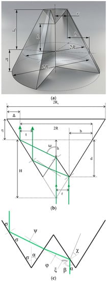 Schematic of a refractive bi-conic axicon: (a) 3D image of the volcone; (b) diagram indicating the dimensions of the axicon elements; (c) diagram indicating the angles of deflection of rays at refractions and reflections from the surfaces of the axicon.