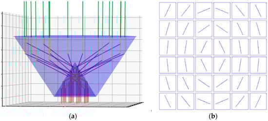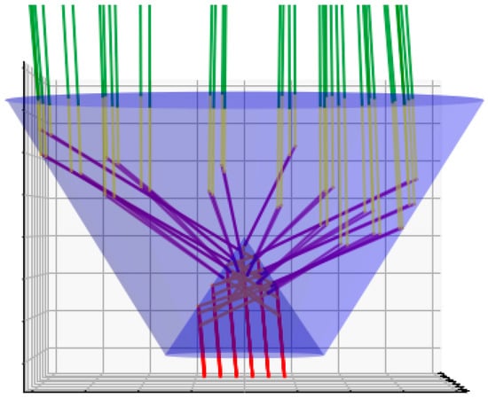We also considered the case of misalignment of the incident beam and the bi-conic axicon axis. The path of the beams through the bi-conic axicon for an incident beam inclination of 5° to the optical axis of the element is shown in Figure 4.