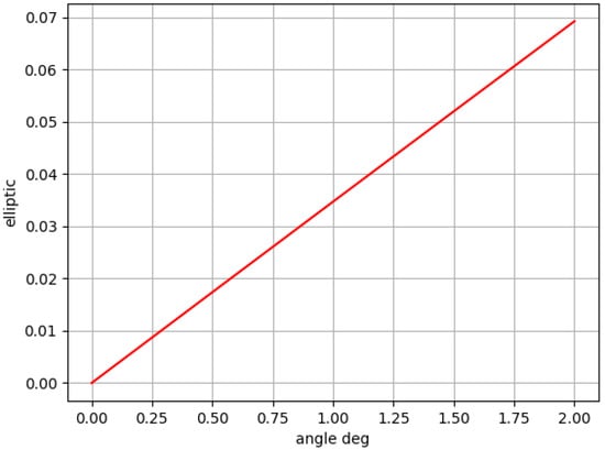 We conducted a study of the tolerance when the incident beam hits the icon of the conical axis at small angles. The incident beam tilt gives the resulting ray ellipticity. The dependence of ellipticity on the angle of inclination of the incident beam to the optical axis of the element is shown in Figure 5. We calculate ellipticity that is introduced when the incident beam falls into the element not exactly perpendicularly using proper accounting of the Jones vector for each ray.