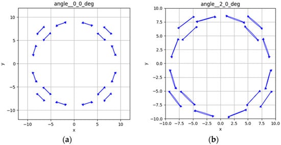 Image of the distribution of polarization vectors in the beam region: (a) in the absence of a deviation of the original beam; (b) with a deviation of 2 degrees.