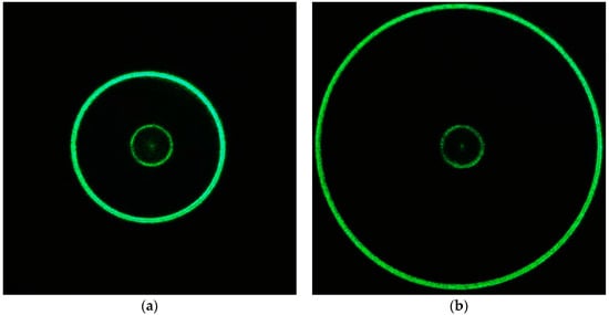 This radiation is localized in the inner ring and the local area inside it. However, there is a non-zero intensity in the center caused by the presence of a vortex phase [,]. In the manufacture of the inner conical surface, it is quite difficult to perform turning and polishing in the area of the center of rotation without error. For the optical experiment, this area was closed to eliminate the effect of manufacturing inaccuracy. The geometric parameters of the conical surfaces, the ratio of the size of the inner cone and the outer one, and the size of the overlap area in the center have an effect on the width and size of the rings in the area of the distribution of laser radiation intensity after passing the bi-conical axicon. In this experiment, we did not adhere to the goal of obtaining the necessary intensity distribution or the necessary dimensions of the annular intensity distribution of azimuthally polarized radiation.