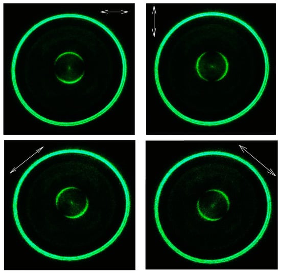 Further, we investigate the transformation of the polarization of the input radiation from circular polarization to azimuthal. The images in Figure 10 show the intensity distributions that are obtained for different orientation of the analyzing polarizer. The white arrow shows the orientation of passing axis of analyzer-polarizer P.