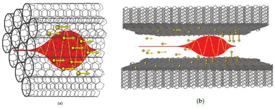 Illustration for CNT to emulate high density plasma. A laser pulse, shown in red, interacts with sheets of CNT, shown in grey. The laser permeates the nanotubes, extracting and accelerating electrons, shown in yellow. (a) CNTs arranged parallel to the laser propagation direction, and (b) CNTs arranged perpendicularly. Reprinted from Ref. [6].