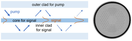 (Left) Illustration of double-clad fiber with step index profile. Center core for signal has highest index; inner cladding for the signal also guides the pump; outer cladding for the pump has the lowest index. (Right) Cross section of an advance large-mode-area photonic crystal fiber using air-holes in the low index regions. The center solid portion is the core for signal and the outer ring of air holes serves as the clad of the pump which guides pump in the fiber structure. It is designed for large-mode-area single-mode and polarization maintaining amplification, reprinted from Ref. [24]. See more about this technology in Section 5.2 and 7.1.