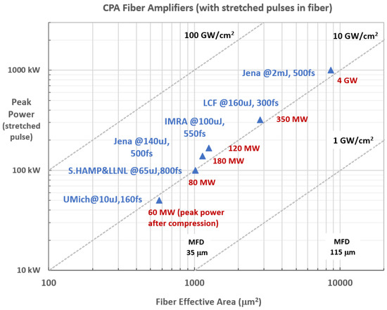 Survey of research work in CPA ultrafast fiber amplifiers from a number of publications in this limited survey. Triangle data points mark reduced peak power of stretched pulse (stretch ratio up to 4000) in fiber amplifiers. Blue notations are the resulted output pulse energy and pulse width after compression and the corresponding output peak power is marked in red. Output peak power up to 4 GW is seen increasing with fiber effective area. The ratio of instantaneous power (stretched) in the vertical axis over fiber area in horizontal axis is light intensity in fiber. Blue triangle data points are seen following along the intensity line of 10 GW/cm2, indicative of the limit imposed by nonlinear phase accumulation as discussed below.