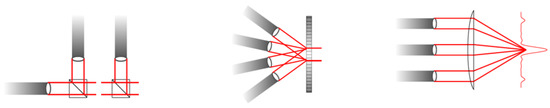 XCAN relies on far field CBC (also described as tiled-aperture CBC), a combining approach inherently limiting the efficiency to η = 65% theoretical value but offering two experimental key advantages: absence of a final optic dealing with the full combined peak and average power (see Figure 5) and near field access to individual control of phase, amplitude and polarization for digital laser applications [47,48].