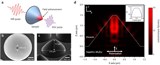 Figure 1a shows a single dielectric nanostructure prepared to generate EUV harmonics by field enhancement. Figure 1b,c show the scanning electron microscopy (SEM) images of the conical sapphire structure. The 1.5 μm long structure, with a 2.6 μm diameter base and 0.2 μm top, was formed using plasma dry etching on a 430 μm-thick flat single-crystalline sapphire wafer with a C-plane. Figure 1d illustrates the field enhancement of the conical sapphire structure. The field enhancement of the structure was calculated using a commercial software program (Lumerical FDTD Solutions). In the finite-difference time-domain (FDTD) calculation, the structure was modeled with cubic elements (5.0 × 5.0 × 5.0 nm). A perfectly matched layer boundary condition was selected to minimize the reflections of the finite boundary. The conical structure was designed as a truncated cone with a top diameter of 180 nm, a height of 1.5 μm, and a base diameter of 2.6 μm. The material properties of sapphire, such as permittivity and refractive index, were obtained from a handbook [32]. The incident laser pulse was assumed to be transform-limited, having an 800 nm center wavelength, with a 12 fs pulse duration. The pulse was incident on the bottom of the sapphire structure with the polarization parallel to the X-axis of the cross-section. The intensity enhancement was defined as . E denotes the amplitude of the enhanced electric field, and E0 is the amplitude of the driving femtosecond laser field. The maximum intensity enhancement occurred inside the center of the conical structure and reached approximately 50. Along the surface of the conical structure, substantial intensity enhancements occurred periodically, reaching approximately 6.8 at the top surface (Figure 1d inset). The enhanced field was symmetric. Since there was no metal-dielectric interface, there was no plasmonic field enhancement as in previous research [30]. The enhancement comes from a combination of the electrostatic lightning-rod effect [33] due to the geometric distinctiveness of sharply pointed structures and an overlapped driving pulse that depends on the internal reflection inside the structure. The enhancements inside the structure and at the inclined surface have periodicity along the X- and Y-axis (Figure 1d). This shows that the overlap between the internally reflected head cycle and the incident tail cycle of the driving femtosecond pulse contributes to enhancement.