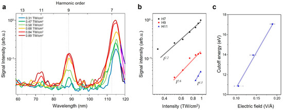 The intensity of the high-order harmonic from the conical sapphire structure depends on the driving laser intensity (Figure 3a). The average laser power was increased from 10 to 170 mW, corresponding to 0.05 to 0.89 TW/cm2 in terms of the peak pulse intensity inside the material. The pulse energy was a few nanojoules. High harmonics up to the 11th order were observed when the focused intensity reached 0.89 TW/cm2. HHG from bulk sapphire in a multi-photon regime follows perturbative scaling, given by , where denotes the intensity of the measured harmonic peaks, I is the peak intensity of the driving pulse, and N denotes the order of the harmonics [25]. Figure 3b shows the dependence of the intensity power for H7, H9, and H11, and each harmonic followed the power law with powers of 2.2, 2.6, and 4.3, respectively. The intensity of the harmonics from the conical sapphire structure behaved non-perturbatively with the laser intensity, similar to the results obtained from the ZnO nanocone [31]. Figure 3c indicates the cutoff energy level of the measured HHG signals, which were linearly scaled with the input electric field in the structure. The cutoff energy was determined as the maximum order of the harmonic peak perceivable in each measured spectrum from the conical sapphire structure.
