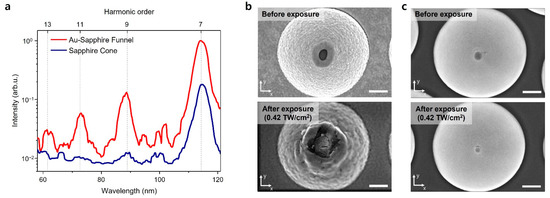 Figure 4b,c compare the gold-layered sapphire funnel structure and the conical sapphire structure. The SEM images were captured after a laser exposure of 0.42 TW/cm2. The SEM image of the conical sapphire structure shows no evident damage compared with that of the structure before laser exposure (Figure 4c). Conversely, the gold-layered sapphire funnel structure showed structural damage. The gold layer was deformed by melting and vaporizing. The surface cracks were formed perpendicular to the direction of the incident laser polarization, which is shown along the Y-axis on the SEM image (Figure 4b bottom; [35]). According to [30], a substantial field enhancement of the gold-layered sapphire funnel structure causes thermal damage even for weak input laser intensities of ~0.1 TW/cm2. Initial signs of thermal damage are the deformation of the gold layer and surface cracking. The deformed structure has reduced field enhancement, and the EUV yield from the structure varies with the exposure time. The conical sapphire structure had a structural change at the apex (Figure 4c bottom), but the EUV harmonics were generated repeatedly under the experimental conditions.