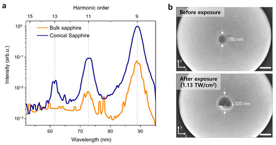 The measured spectra from the gold-layered conical sapphire structure and the conical sapphire structure are shown in Figure 4a. The incident laser intensity was estimated to be 0.42 TW/cm2 in the materials. Both nanostructures amplify the driving laser fields and generate high-order harmonics in the EUV band. The gold-layered sapphire funnel structure emanates harmonics up to the 13th order, and the conical sapphire structure radiates up to the 9th order. The intensity of H7 from the gold-layered conical sapphire structure is six times higher than that from the conical sapphire structure. The profile of the intensity enhancement from the tip of the conical sapphire structure (Figure 1d inset) is different from that of the gold–sapphire funnel structure [30]. The average intensity enhancement of the tip of the conical sapphire structure was approximately 6.8, and the enhancement factor was uniform along the tip surface. The gold-layered conical sapphire structure has an irregular profile with a higher intensity enhancement factor [30]. The maximum enhancement factor was approximately 20 dB at the edge of the tip, which was the metal and dielectric interface. The intensity enhancement factor of the center area reached approximately 10 dB. The higher intensity enhancement of the gold-layered conical sapphire structure led to a higher intensity and cutoff extension of the harmonic generation under identical conditions.