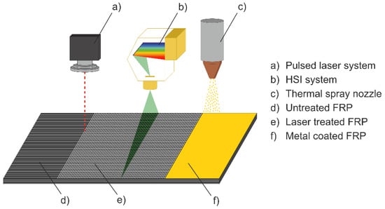 The first step of the process chain involved surface preparation treatment before applying the coating. Figure 1 shows schematically the complete process chain. First, the CFRP was structured using a pulsed laser beam. Afterwards, the HSI camera was used to scan the pre-treated area to detect the surface quality. Finally, the thermal spray process was applied for depositing the metal coating on the laser structured CFRP substrates. In this work, the process was performed discontinuously.