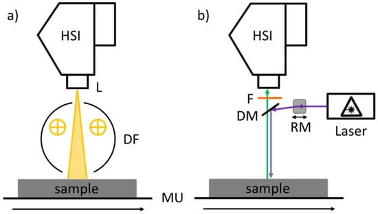 (a) Schematic representation of the VNIR HSI system and (b) schematic representation of the Laser HSI system. HSI: VNIR HSI camera. L: Lens. DF: Diffuse halogen illumination. F: Long pass filter. DM: Dichroic mirror. RM: Rotating mirror. MU: Motion unit.