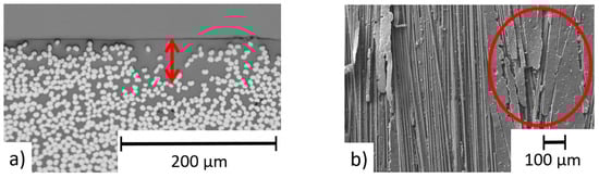 (a) Cross-section of CFRP with a highlighted area of a higher amount of epoxy resin; (b) heterogeneous ablation result due to heterogeneous amount of epoxy resin covering the carbon fibers, circle shows area of insufficient ablation.