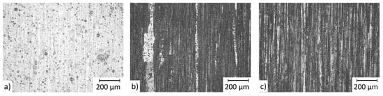 As it can be seen in Figure 4, in case of insufficient ablation (Figure 4a) the topography is characterized by a high amount of matrix. The carbon fibers are still covered by remaining epoxy because the polymer matrix was only partly ablated. An optimal ablation (Figure 4b) is given, by a heterogeneous surface structure. A small amount of matrix residues (reflective, white areas in Figure 4b) remained locally limited due to variations of the amount of polymer matrix above the filaments. The carbon fibers are not affected by the laser treatment. Finally, Figure 4c shows the damaging ablation condition, characterized by a homogeneous structure without matrix residues. The surface shows a high amount of damaged carbon fibers, visible in Figure 4c by shadowing effects along the filaments. Both, the polymer matrix and the carbon fibers were ablated during the laser process. The low surface roughness in the areas of matrix residues will lead to gaps during the coating deposition [33].