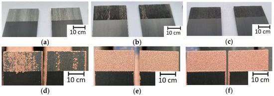 In Figure 5 the coating adhesions for the three surface conditions are exemplarily presented. As expected, the composite material surfaces with insufficient ablation led to a very heterogeneous coating adhesion (in Figure 5a,d). Areas of the specimen that appear darker in Figure 5a because the carbon fibers are locally closer to the surface, are partially covered with copper in Figure 5d. Due to the high amount of plastic residue or the low amount of exposed fibers, the substrate surface of insufficient ablation offers too few adhesion points for the metal particles.