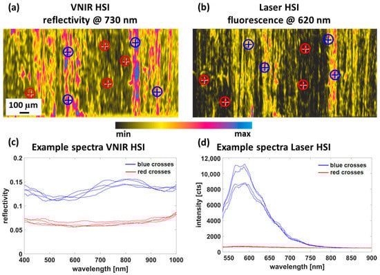 Examples of hyperspectral measurements for a laser processed CFRP sample. (a) Reflectivity (VNIR HSI) and (b) fluorescence (Laser HSI) at the indicated wavelength. Example spectra (c,d) of the hyperspectral measurement, the position of which is marked by colored crosses in the upper figures.