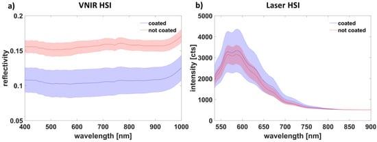 It was also investigated whether there are differences between the spectra of the well coated and the poorly coated sample areas on average. Figure 8 shows the mean spectra of the VNIR HSI and the Laser HSI measurements for the coated and the non-coated samples. For the VNIR measurements (Figure 8a), it can be seen that the uncoated areas show a higher average reflectivity than the copper coated samples. In contrast, the coated areas show a greater variance in the recorded intensity. These results are in good agreement with the findings in Figure 7: The samples with poor copper coating adhesion have been insufficiently processed by the laser (insufficient ablation, Figure 7a–c) and show a relatively high and constant reflectivity. In contrast, the samples with good coating coverage (optimal and damaging ablation, Figure 7d–i) show many areas of weak reflectivity, but at the same time are very inhomogeneous due to the high reflectivity of the exposed carbon fibers.