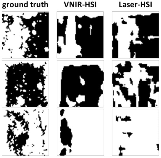Ground truth and predicted copper coating for three samples from the test dataset for the two HSI methods. White pixel are copper coated and black pixels are not copper coated. The images only show samples with insufficient material removal. For the optimal and the damaging ablation, the complete copper coating was predicted correctly for both HSI methods.