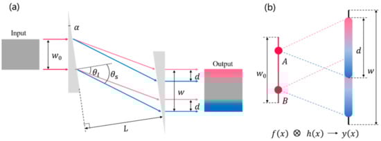 Owing to the angular dispersion of the prism pair, light with different wavelengths will be output at different angles from the first prism and will be distributed at different positions after being collimated by the second prism. The spatiospectral distribution of the nearby spots of the incident laser beam will overlap in the output beam; therefore, the intensity of the output laser beam is redistributed. Figure 1b illustrates this redistribution principle using two nearby input light spots, A and B. Assuming that the laser spectra are the same for all spots in the incident laser beam, both A and B will be extended from a spot to a line with a length . If the distance between A and B is smaller than , there is spatial overlapping of different wavelengths in the output laser beam for A and B. The process depicted in Figure 1b, which induces spatial dispersion by angular dispersion, can also be explained using convolution, as expressed in the following equation: