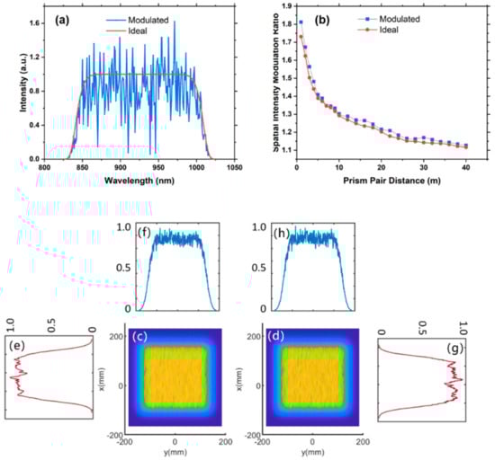 This discussion pertains to an ideal case with a smooth spectrum without spectral intensity modulation. However, a completely smooth laser spectrum does not exist in reality. Here, we simulate laser beam smoothing using modulated spectra. Figure 3a shows the 1D shape of the ideal and modulated spectra. As the distance of the prism pair is increased, the LSIMR curves that a laser beam passed through a right-angle prism pair with an apex angle of 20° are shown in Figure 3b. According to the simulation results, the spectrum with intensity modulation does not have a significant influence on the LSIMR. This is because the LSIMR is the convolution of the intensity of the incident laser beam and the intensity of the spectrum of the laser beam. Figure 3c–h shows the 1D and 2D spatial intensity profiles of the output laser beam smoothed by the input laser beam with an ideal spectrum and modulated spectrum passing over a distance of 8 m prism pair with an apex angle of 20°. From Figure 3c–h, it can be seen more intuitively that the shape of the spectrum has no effect on the smoothing beam.