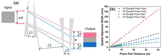 The simulation results showing the variation of the spatial dispersion width with are shown in Figure 5b, where the apex angles of the prisms are 10° and 15°. It is found that the spatial dispersion width of two prism pairs is equivalent to that of a single prism pair with twice the apex angle. This means that two prism pairs with an apex angle of 15° are equivalent to a single prism pair with an angle of 30°. For a small apex angle prism of 15°, when the spatial dispersion width reaches 60 mm or 10 mm, a single prism pair needs a distance of 68 m or 12 m, respectively, whereas two prism pairs only need a distance of 16 m or 3 m. The results save 52 m or 9 m of prism pair distance, respectively, by comparing a single prism pair of 15° with an induced spatial dispersion width of 60 mm or 10 mm. Obviously, this combination of prisms not only reduces the spacing between prisms but also retains the advantages of prisms with small apex angles.