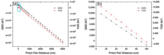For the negative dispersion from the angular dispersion induced by the prism pair, the second-order dispersion GDD and the third-order dispersion TOD are simulated based on formulas (5) and (6), respectively. In the simulation, the apex angle of the prism is 20°, the center wavelength is 925 nm, and the beam size is 370 × 370 mm2. The spectral shape of the input beam is set to a 7th-order flat-top super-Gaussian, and the spectral range is 825–1025 nm. The GDD and TOD generated by material dispersion are related to the prism insertion; the first prism insertion is 10 mm, and the second prism insertion is 400 mm in this simulation here. For a single prism pair, the induced GDD and TOD with a center wavelength of 925 nm vary with the prism pair distance. Figure 7b shows the enlarged part marked by the blue box in Figure 7a. As can be seen, the total introduced GDD and TOD are both positive values at the beginning because the relatively large prism and thick material induce positive dispersion. When the prism pair is spaced by approximately 0.9 m, the angular dispersion induces negative dispersion, and the material-induced positive dispersion is balanced, which induces a nearly zero GDD and TOD. In this case, the induced spatial dispersion width is approximately 1.3 mm. As the prism pair distance increases, GDD and TOD become negative and increase linearly.