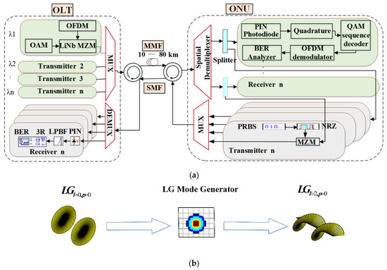 The schematic diagram of (a) the proposed OAM-DM-WDM-OFDM-PON system; (b) LG l = 2, p = 0 mode generation.
