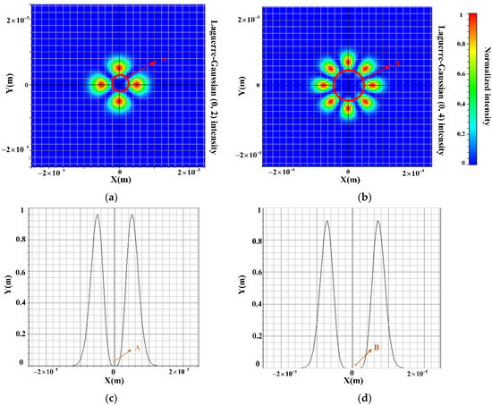 3-Dimension and 2-Dimension transverse electric field intensity of the (a,c) LG l = 0,p = 2; (b,d) LG l = 0,p = 4 mode. A, B: optical zero vortex radius.