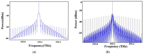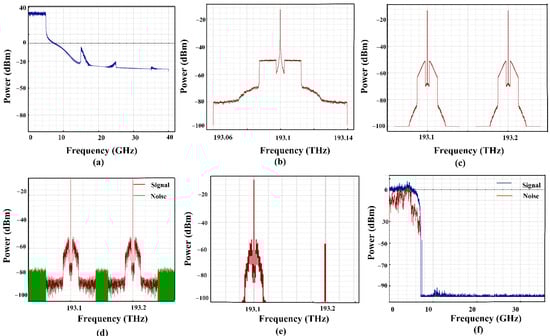 At the OLT side, two random binary sequences with a 10 Gbps data rate are provided by pseudo-random binary sequences (PRBS) generator for each wavelength and then entered into a 4-QAM generator with 2-bits per symbol sequence. Subsequently, the output 4-QAM signal is transmitted to the OFDM modulator for mapping 512 subcarriers, 1024 FFT points, and 64 cyclic prefix points. As shown in Figure 4a, the power of OFDM modulation signals is 30 dBm at both 20 GHz and 40 GHz. After the OFDM modulator, the signal gets into the quadrature modulator (QM) with a 7.5 GHz frequency through the low pass cosine roll-off filter. Both the downstream and the upstream frequencies (193.1 THz and 193.2 THz) are set with an interval of 100 GHz. These frequencies are emitted by utilizing pairs of continuous wave (CW) lasers with a linewidth of 0.01 MHz. Besides, the Gaussian mode is converted to LG mode carrying a special radial index in a Laguerre Transverse Mode Generator. The LiNbO3 Mach-Zehnder modulator (MZM) has three input ports comprising LG mode and two electrical signals from QM. The signal spectrum at 193.1 THz after the LiNbO3 MZM is shown in Figure 4b. After that, two modulated OFDM signals based on LG mode with two wavelengths are multiplexed through a WDM multiplexer (mux) before coupling into the MMF. The multiplexed signal spectrum before and after MMF transmission is depicted in Figure 4c,d, respectively. One can be observed that the spectrum power has a remarkable decrease after MMF, which is mainly caused by the noise and attenuation effect of fiber. After propagating for a certain distance in MMF, the multiple LG-WDM signals are de-multiplexed into a single LG mode through a spatial de-multiplexer. The transmission attenuation is 0.2 dB/km. It is worth noting that the signals carried by different OAM modes cannot interfere with each other. Then, the signal is divided into two streams by a WDM de-multiplexer (de-mux) through the wavelength, as shown in Figure 4e.