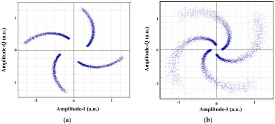 To start, the received OFDM constellation diagrams of the proposed OAM-DM-WDM-OFDM-PON system at 10 Gbps and 20 Gbps are presented in Figure 6a,b, respectively. It can be seen that the quality of the constellation diagram degrades with the data rate increases, which means the stronger attenuation introduces distortion into the signal. As shown in Figure 7, under 10 Gbps data rate, the eye diagrams of upstream and downstream links after 10 km propagation distance are successfully demonstrated with favorable transmission performance.
