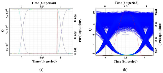 At the ONU side, a fork component splits signals into two different paths, one for de-multiplexing, and one for the carrier of the upstream link. In the de-multiplexing path, the received signal via the photodetector and obtain gained by the electrical amplifier. As shown in Figure 4f, the modulated signal is de-multiplexed back to the initial signal through quadrature, OFDM demodulator, and QAM decode. For the other path, the optical carrier from the downstream link loads the non-return-to-zero (NRZ) signal through MZM for upstream transmission. In the end, the electrical signal is regenerated through the 3R regenerator and sent to the BER analyzer for bit error rate, Q-factor, and eye diagram performance measurement.