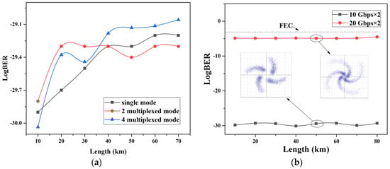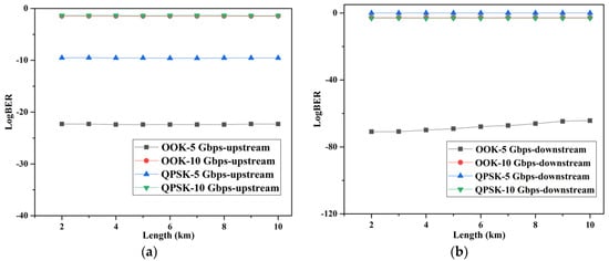 The comparative analysis of the BER features based on the OOK and QPSK modulation is plotted in Figure 11a,b. Especially, it only takes a low data rate with 5 Gbps and 10 Gbps in the system. As shown in Figure 11a, the BER values of the two systems are relatively large under 10 Gbps transmission rate. One possible reason is that the signal carriers from downstream links suffer from modal crosstalk, which reduces the optical power. Another possible reason is that the limitation of SMF leads to the attenuation of signals. Figure 11b also depicts the BER of the downstream link versus the transmission distance and a total capacity of 10/20 Gbps below the FEC limit is achieved. The results of this figure highlight the importance of modulation format and transmission rate to system performance.