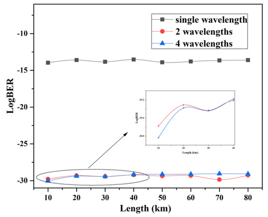 In Figure 9, simulated investigations are undertaken for the OAM-DM-PON system over a single wavelength, 2 wavelengths, and 4 wavelengths channel. For transmission distances varying from 10 km to 80 km, the BERs of the hybrid system with single and 2 wavelengths fluctuate around and , respectively. It can be seen that the performance of 2 wavelengths system is similar to the 4 wavelengths system. It shows that the system with 2 wavelengths as well as 4 wavelengths has a better performance compared with the single wavelength transmission. Furthermore, it can also be seen from Figure 9 that as the transmission distance increases, the BER performance of the three systems is deteriorated.