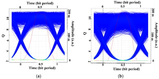Eye diagrams of (a) downstream; (b) upstream link after 10 km transmission distance.