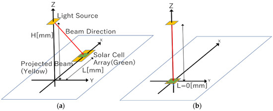 Figure 1 is geometrical configuration of the analysis. The shape of the solar cell array module is a 100 mm × 100 mm square, which would generate power up to a few tens of watts, and it is placed at (L, 0, 0) in the coordinate system in Figure 1a. L varies from 0 mm in Figure 1b to 100,000 mm (100 m). The size of this array is suitable for light beam propagation and many indoor and outdoor applications of OWPT of this scale are expected. The shape of the array is assumed as a rectangle and its orientation is fixed along the X-axis. A typical realization of this configuration is movements of an automatic guided vehicle (AGV), which would move along a fixed axis during some period of time. There would be more than one transmitter in a service area and one of the transmitters tracks AGV and adjusts the beam shape and alignment within the limit of its own service area, and then hand over to the other transmitter outside of it. The emission center of the beam is (0, 0, H) on the Z-axis, and H is fixed as H = 2500 mm (2.5 m), which is expected to be an easily accommodative condition realized as an indoor facility’s typical height of ceiling or in an outdoor environment. The beam shape is square and is tilted around the Y-axis to irradiate the array displaced in the X direction on the XY plane, while the position of the emission center is fixed. The beam propagates with a particular beam divergence angle and its projected shape is deformed from square to generally trapezoid, which is strongly dependent on L.
