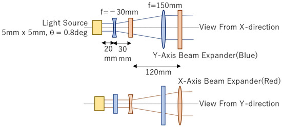 To evaluate errors and to consolidate requirements for all DoF of beam alignment and shaping, an appropriate optics model is necessary to conduct a performance simulation dealing with three-dimensional errors. Even though beam shaping mechanisms are proposed for OWPT [27,28], they consist of static beam shaping, or a complex mechanism for quite long-range utilizing adaptive optics. Here we propose a simple model that supports variation of focus to adopt moving targets with about 100 m range. The size of the light source at (0,0,H) is 5 mm × 5 mm (square), its beam divergence is 0.8 degrees (half angle), and its power profile is top hat. For much longer distance transmission, a gaussian beam with a homogenizer at the receiver side will provide essentially the same result as this power profile. Since the projected beam shape at the solar cell array location on the XY plane is different in the X and Y directions, independent beam shape correction is necessary on each axis. Then, as shown in Figure 2, an optical system is proposed based on two independent beam expanders consisting of convex and concave lenses. To perform beam shape corrections independently for the X- and Y-axis directions, two identical cylindrical beam expanders are configured orthogonally and shifted 30 mm along the optical axis (beam direction). The lenses of each beam expander are cylindrical, and their focal lengths are 150 mm (convex) and −30 mm (concave), and the two lenses are separated 120 mm nominally. Some of the given geometric parameters in Figure 2 can be changed and adjusted depending on the actual operational system design.