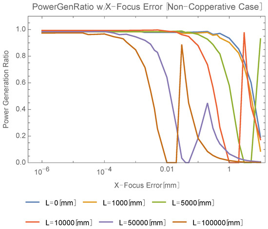 Similar requirements were obtained for the Y direction (Figure 5). Similar peaks in the power generation ratio were observed to those in Figure 4. Determined at an 80% power generation ratio, the requirements for focus adjustment are, e.g., less than 1.32 mm (L = 1 m), 132 μm (L = 10 m), or 1.2 μm (L = 100 m).